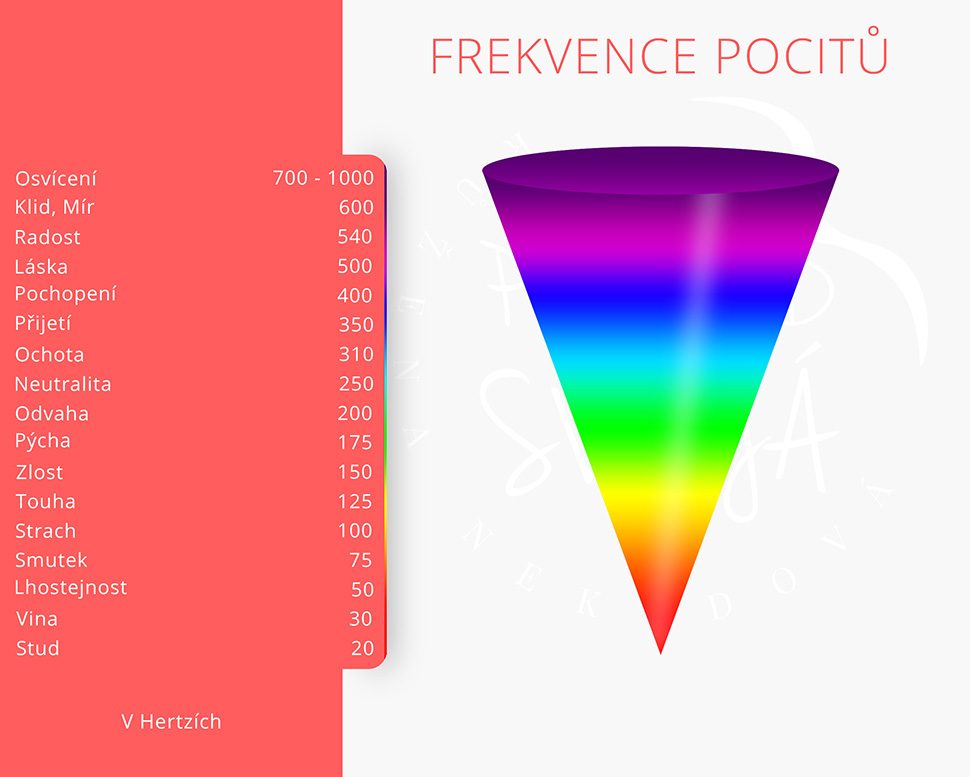 Naše energetické vibrace jsou určeny myšlenkami, pocity a emocemi, kterými zrovna oplýváme. Každá myšlenka, emoce nebo pocit má vibraci, kterou lze měřit. S každou emocí se mění naše frekvecne a to velmi rychle.